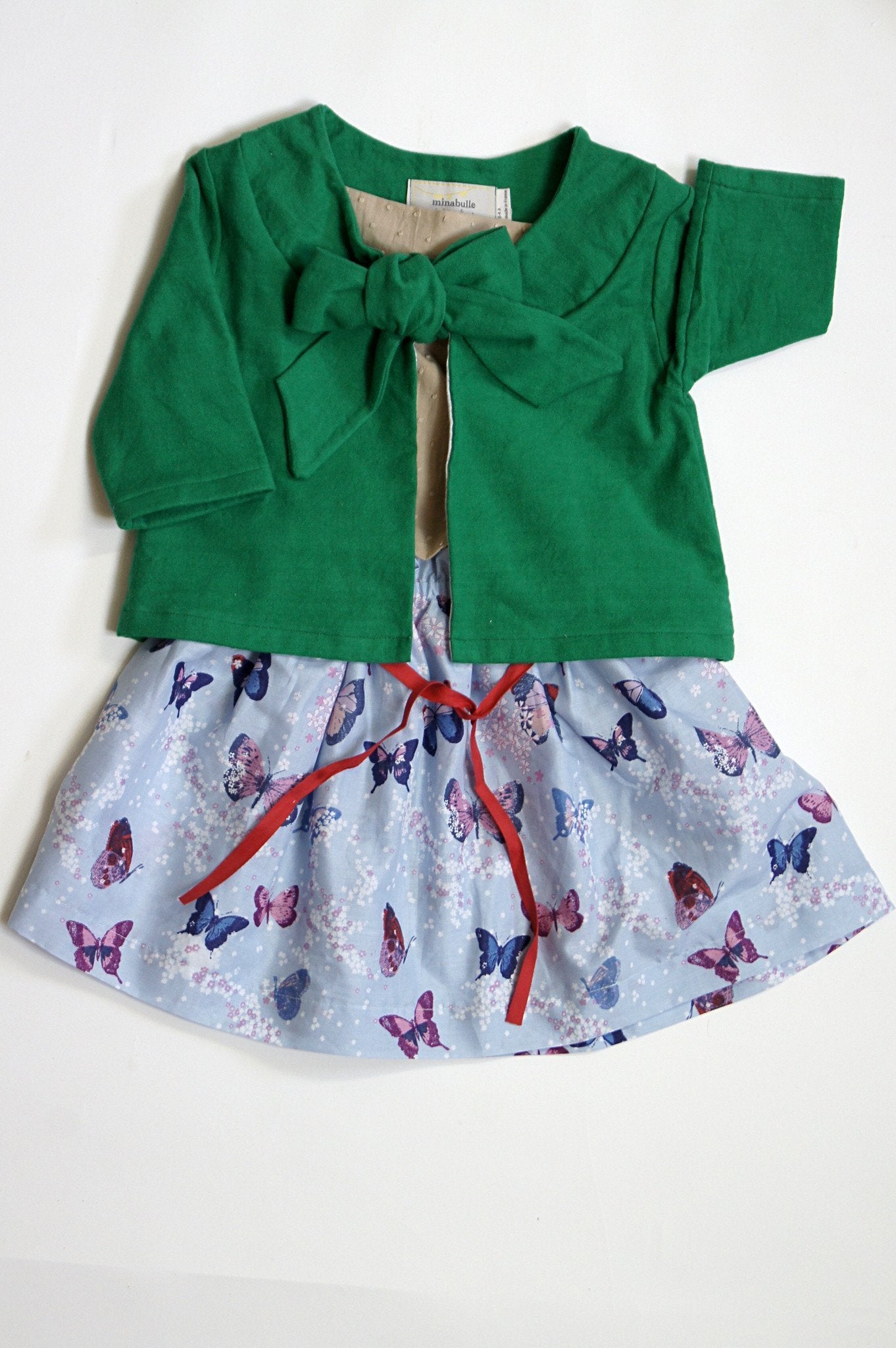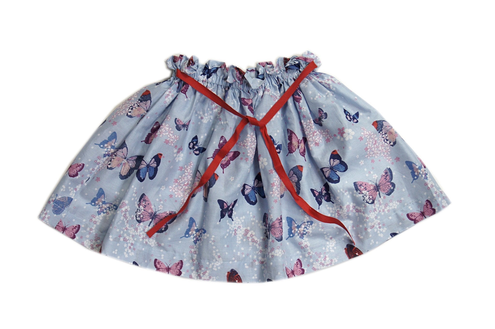 Jupe imprimée papillon, un bandeau rouge. 100% Coton.