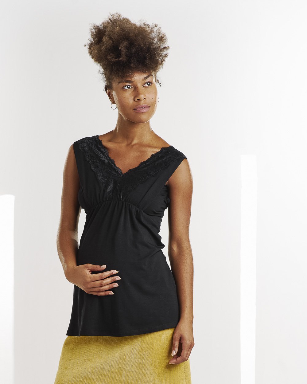 Jolie top noir léger avec de la dentelle idéale pour l’allaitement.