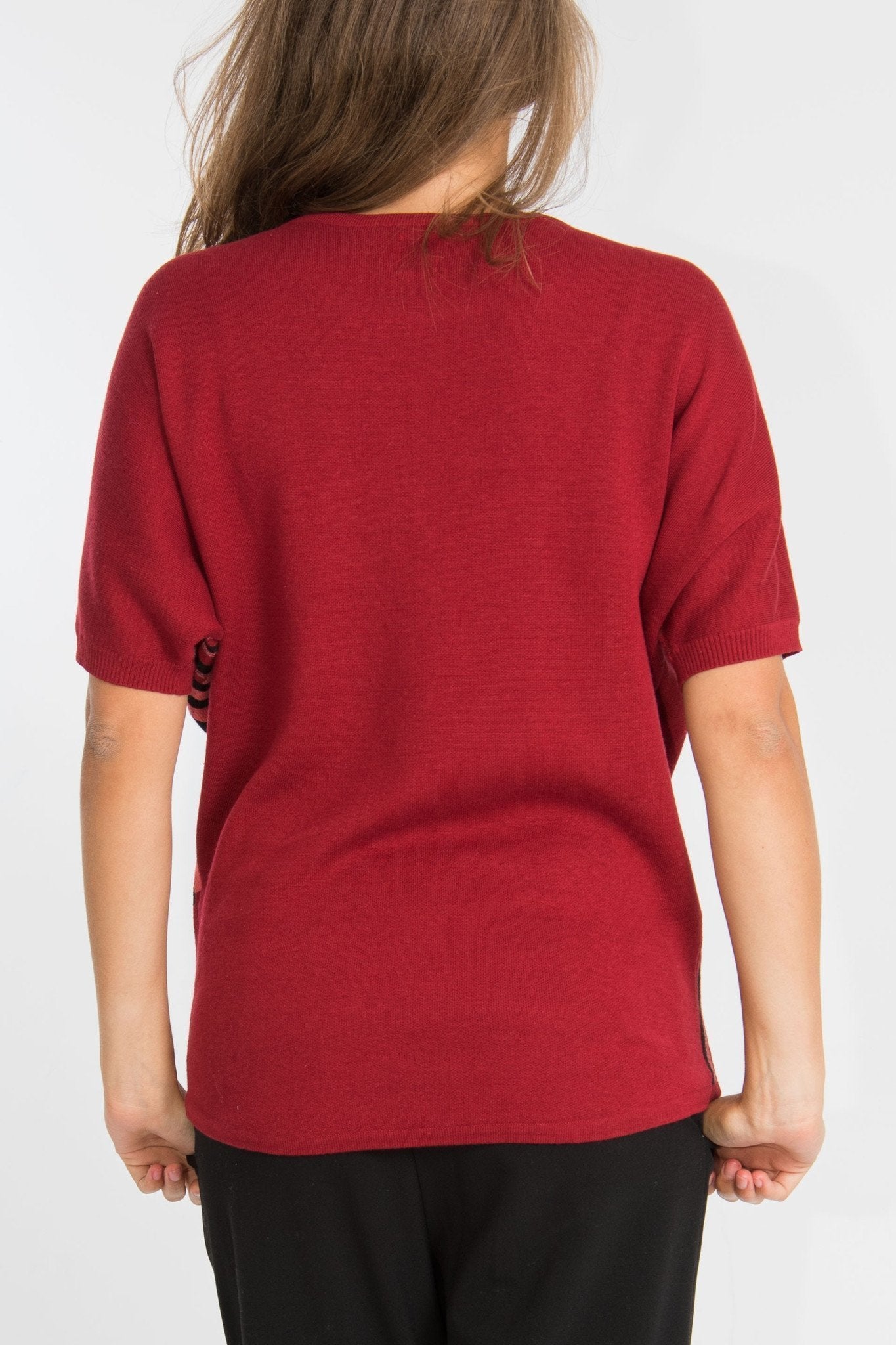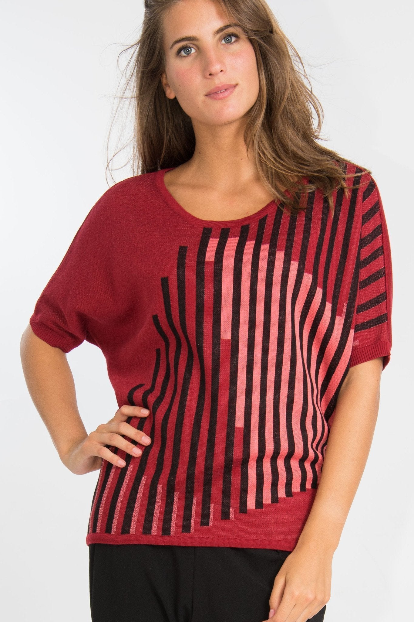 Un pull tout à fait original, des traits verticaux pour mettre en avant votre silhouette. Du fil brillant sur la manche gauche.