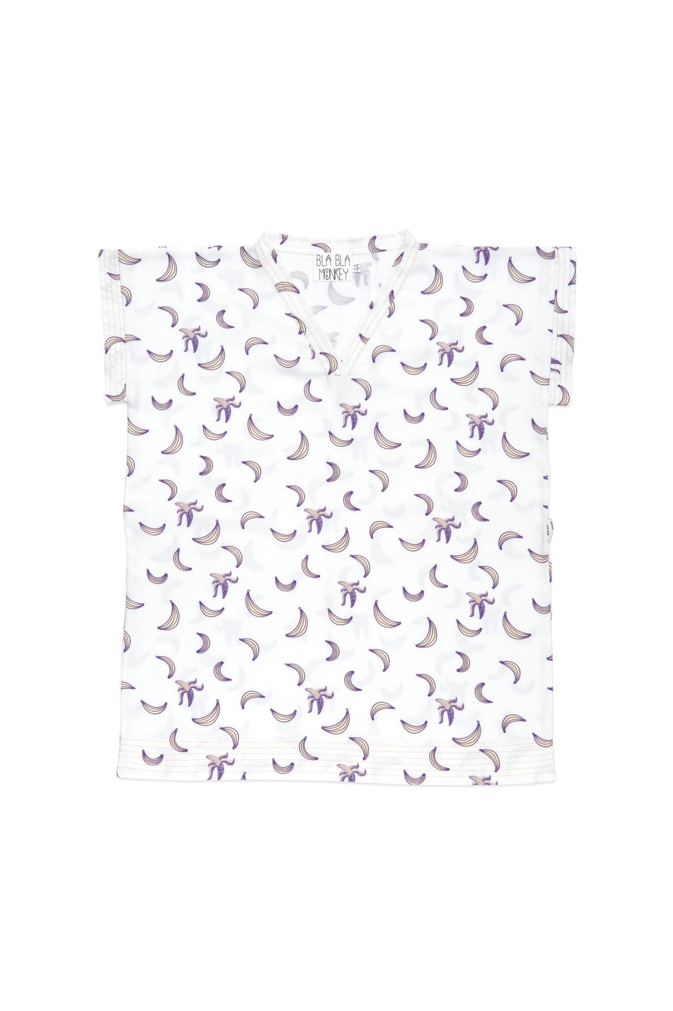 *DETAIL : Robe courte, inspiration djellaba, finition 3 coutures au col et manches, et 6 coutures à l'ourlet du bas *MATIERE, COMPOSITION & COLORIS : Tissus viscose au touché soyeux et souple blanc imprimé banane jaune pale et violet crée par Bla Bla monkey, fil or *MADE IN PORTUGAL : Tissus et confection